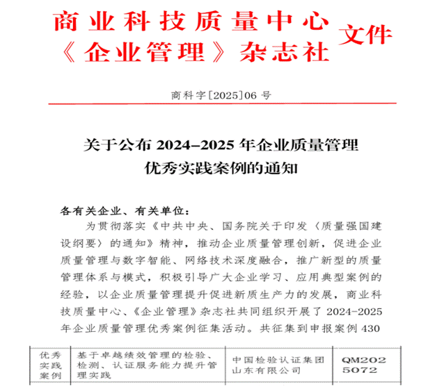近日,由国务院国资委商业科技质量中心与《企业管理》杂志社联合主办,面向中央企业、大型国企及行业代表性企业的“2024-2025年企业质量管理优秀实践案例”评选结果正式揭晓。中国中检山东公司(以下简称“山东公司”)申报的《基于卓越绩效管理的检验、检测、认证服务能力提升管理实践》案例,从全国申报案例中脱颖而出,荣获“企业质量管理优秀实践案例”称号(编号:QM2025072)。这一荣誉标志着山东公司在质量管理领域的创新成果获得国家级权威认可。