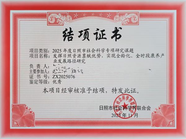 近日,日照市社科联公布2025年度日照市社科研究课题鉴定结果,日照检验认证有限公司(以下简称“日照公司”)课题《发挥日照资源禀赋优势,实现全龄化、全时段康养产业发展路径》获评优秀等次。这是公司深化“党建+科研”
