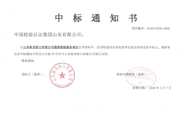 4月14日,山东公司所属龙口检验认证有限公司凭借精湛的专业技术、严谨的服务品质与深厚的行业积淀,成功中标山东裕龙热力有限公司2026-2027年度煤炭检验业务,实现“连续三年”中标该项目,以硬核实力续写央地合作新篇章。